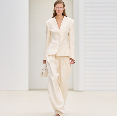 Die SS26 Runway Collection folgt dem Drang nach Vereinfachung, bringt die Mode zurück zu ihrer Bedeutung und lässt die Formen die Materialien zur Geltung bringen – Seidencanvas, Tussahseide, Kaschmirgaze, Seidenmoiré, Nappa, Denim –, während die Materialien ihre Qualität durch Farbe zum Ausdruck bringen: Weißtöne, von Butter bis Optik, neben Rost und Magmarot.