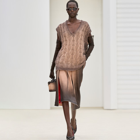 Die Bewegung der Kollektion beginnt mit dem leeren Canvas langer Kleider und locker geschnittener Tailoring-Pieces, fließender Hemden und Cargohosen; sie setzt sich fort mit einem dynamischen Zwischenspiel aus geschwemmtem Leder, säuregeätztem Denim und airbrush-behandelten Strickstücken für mutige Designs; und endet in sinuoser, skulpturaler Fluidität mit silbrigem, absolutem Schimmer. Die Reduktion fokussiert auf ein Kleidungs-System, das zugleich pragmatisch und selbstbewusst ist.